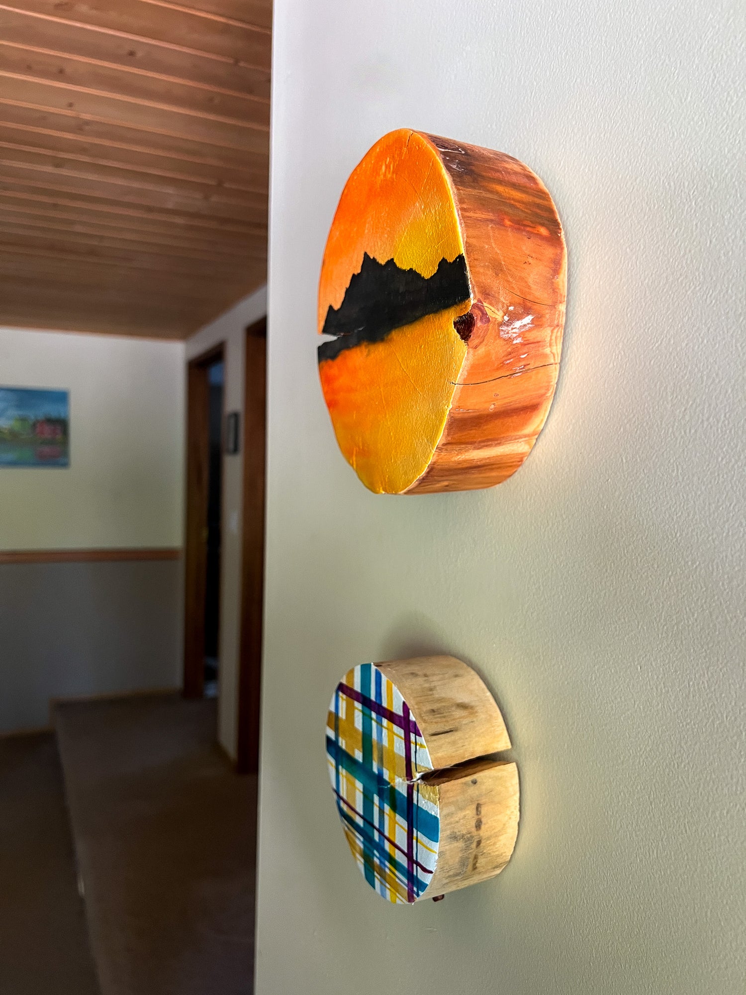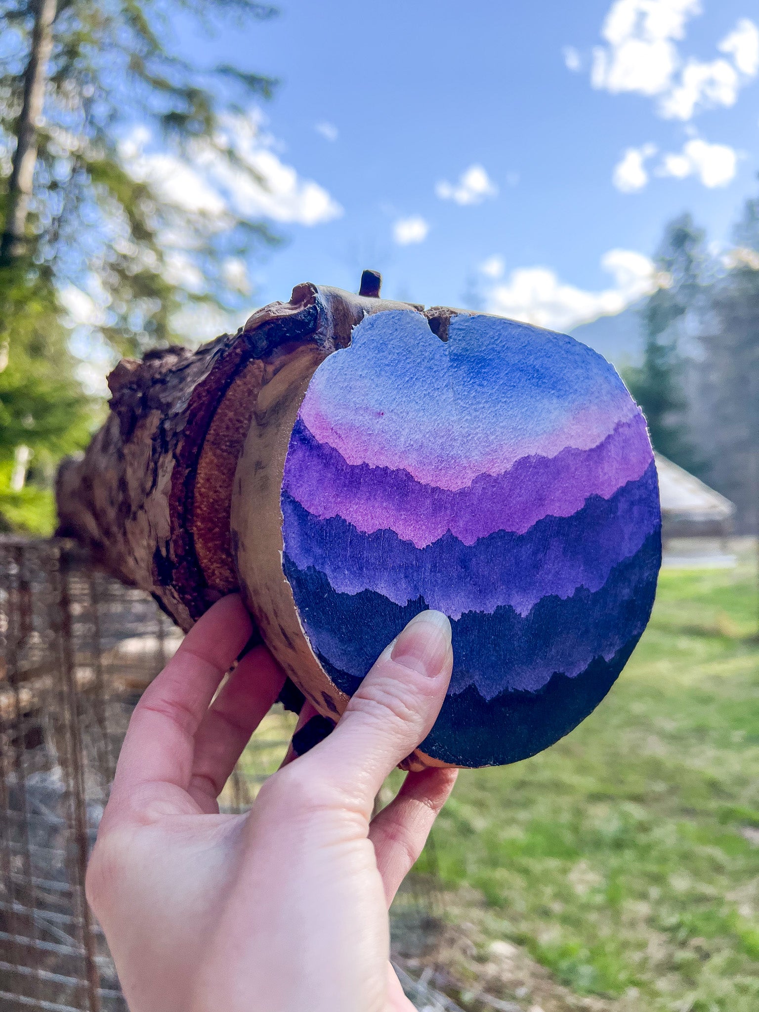 I'm based in Kaslo, British Columbia, a small mountain village in the Kootenays. It's therapeutic to head out into the woods of our acreage and find fallen trees with character. Then, they're cut into rounds and I bring them back to life with vibrant watercolours. Every detail is handcrafted specifically for an audience who resonates with irregular contours and the intermingling of unusual colour harmonies.